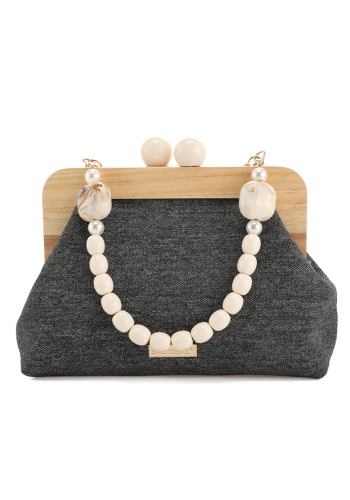 Vintage styled τσάντα/ φάκελος με ξύλινο πλαίσιο και τζην ύφασμα Αποτελείται από ένα ενιαίο χώρο με τσέπη και κλείνει με μαγνητικό κούμπωμα Διαθέτει αποσπώμενο λουράκι με πέρλες και extra αλυσίδα ώμου Διαστάσεις: • Πλάτος: 7,5 cm • Μήκος: 23 cm • Ύψος: 16 cm