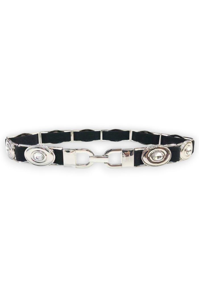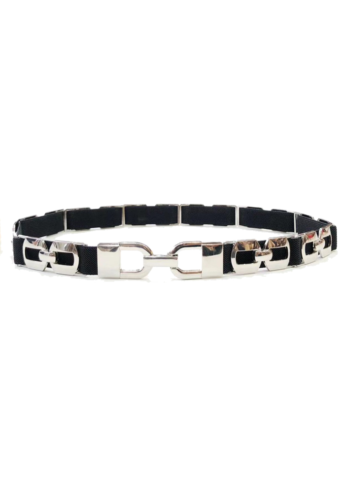 Chic ζώνη/λάστιχο με ασημί μεταλλικά στοιχεία Υλικό: Μέταλλο / Λάστιχο Χρώμα: Μάυρο/Ασημί Διαστάσεις: 70 x 2εκ.