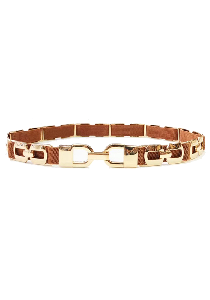 Chic ζώνη/λάστιχο με χρυσά μεταλλικά στοιχεία Υλικό: Μέταλλο / Λάστιχο Χρώμα: Κάμελ/Χρυσό Διαστάσεις: 70 x 2εκ.