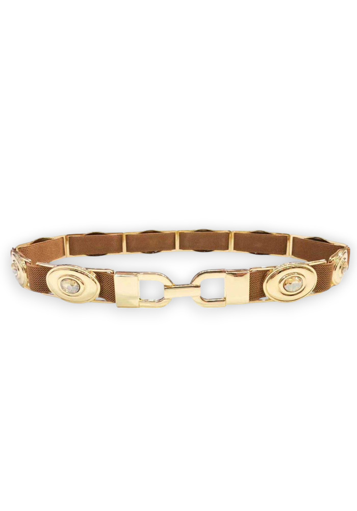 Chic ζώνη/λάστιχο με χρυσά μεταλλικά στοιχεία και strass Υλικό: Μέταλλο / Λάστιχο / Strass Χρώμα: Ταμπά Διαστάσεις: 70 x 2εκ.